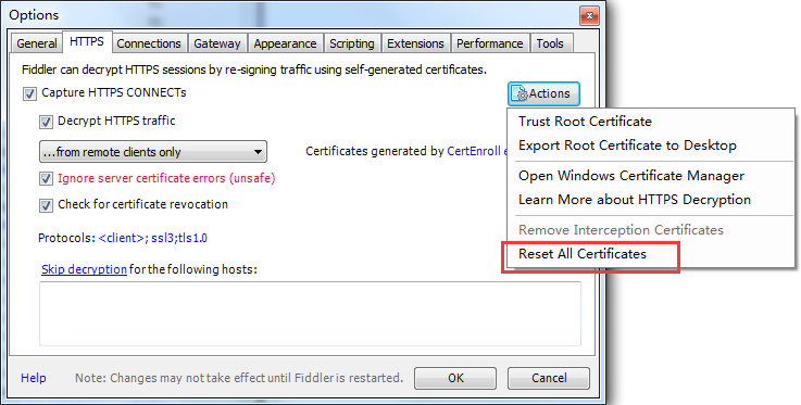 2.如方法1无效,可以尝试重置Fiddler中的所有证书后,并在手机上重新安装证书;