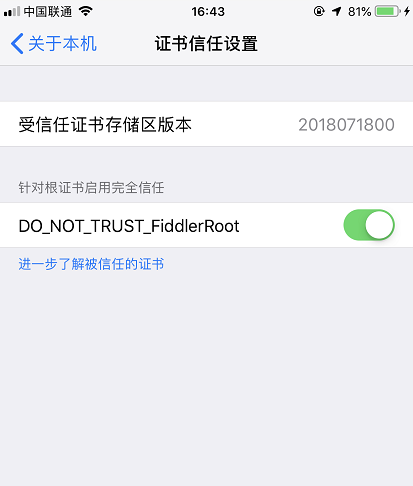 入主题吧,首先Fiddler设置好代理,然后手机安装证书好了,设置手机代理,结果iphone无法访问网络,网上搜索一堆所谓的解决办法,但都因文章太老旧而无法解决当下的问题,最终居然是iphone的ios版本高于10,所以要多一步打开信任设置才能正常访问网络。
