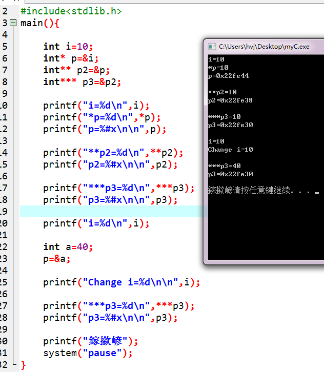 如上例中,可以通过*p=20或**p2=20或***p3=20来改变i(后面改为了a)的值(上面没贴,看了这段话,你应该能明白了吧)