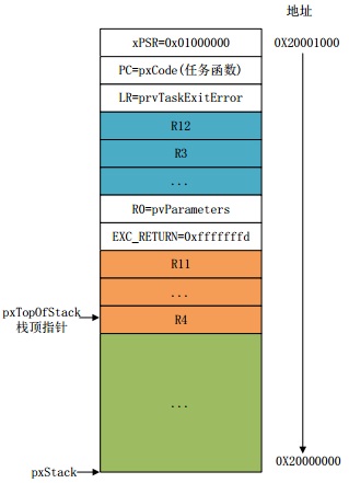 | +----pxPortInitialiseStack初始化任务堆栈