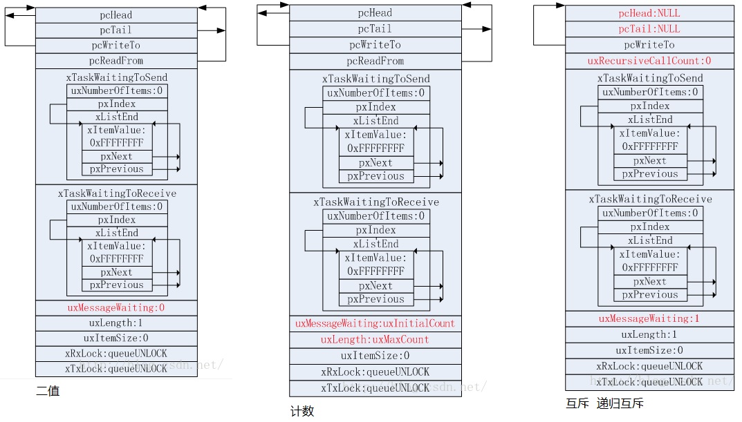 二值、计数、互斥、递归互斥,创建完成之后的内存状态:(转自 http://blog.youkuaiyun.com/zhzht19861011/article/details/51537234)