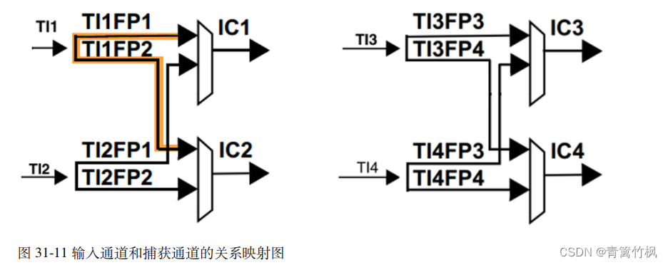 当使用PWM输入模式的时候,一个输入通道(TIx)会占用2个捕获通道(ICx),因此一个定时器只能使用2个输入通道。