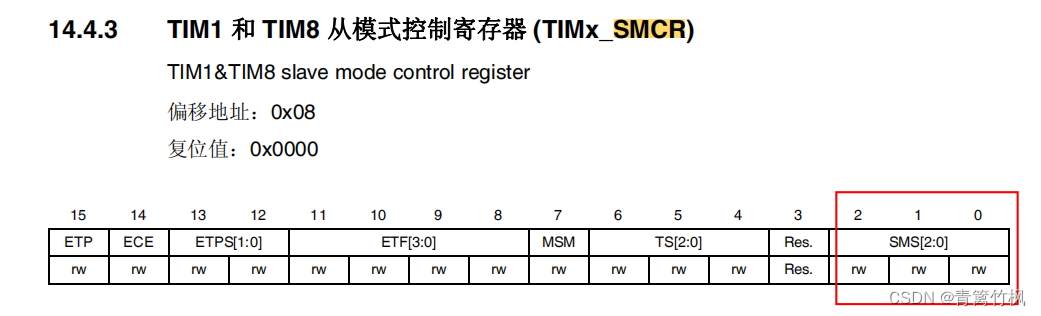 PWM信号输入TI1,会被分成两路,TI1FP1和TI1FP2,其中,一路是周期,另一路是占空比,具体哪一路信号对应周期还是占空比要从程序上设置哪一路信号作为触发输入,作为触发输入的就是周期,另一路就是对应的占空比。作为触发输入的信号还要设置极性,是上升沿捕获还是下降沿捕获,一旦设置好触发输入的极性,另外一路硬件就会自动配置为相反的捕获极性。总之,就是确定输入通道,确定触发信号,然后设置触发信号的极性即可,因为是PWM输入,另一路信号会由硬件配置。使用PWM输入模式是逆序将从模式控制器配置成复位模式(由配置寄存器SMCR的位SMS[2:0]来实现),当启动触发信号开始进行捕获时,同时把计数器CNT复位清0