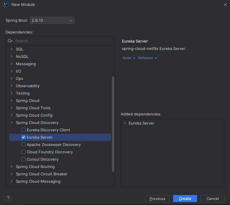 点击Create即可创建一个Module,同时引入Eureka依赖。