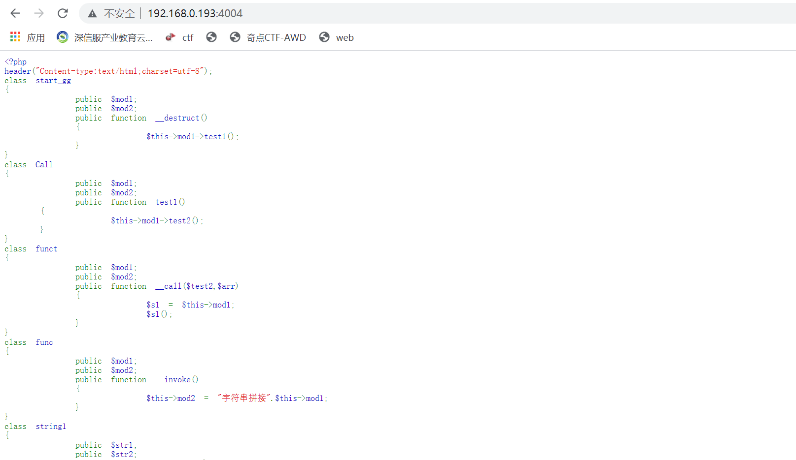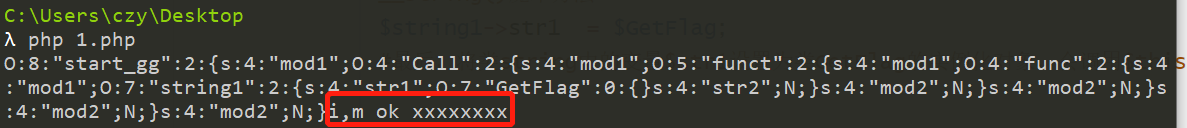 #现在POP链执行了func中的魔术方法__invoke, $this->mod2 = "字符串拼接".$this->mod1;代码会被执行,其中$mod1被当作字符串处理,可以将$mod1设置为class string1的实例化对象,会自动搜索并调用类string1中的__string()魔术方法