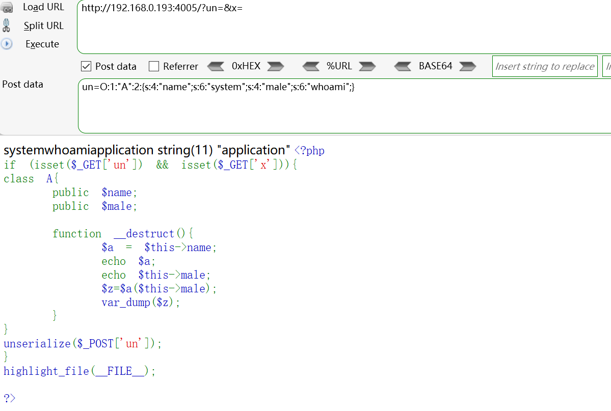 name赋值为system,$male赋值为whoami,即调用system(whoami)