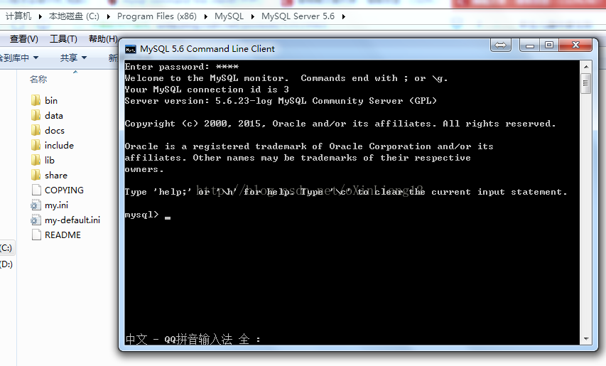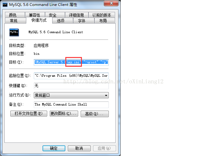 从"开始"栏找到MySQL 5.6 Command Line Client The MySQL Command Line Shell右击属性,在目标一栏看到MySQL目录指定到了一个叫"my.ini"的配置文件,