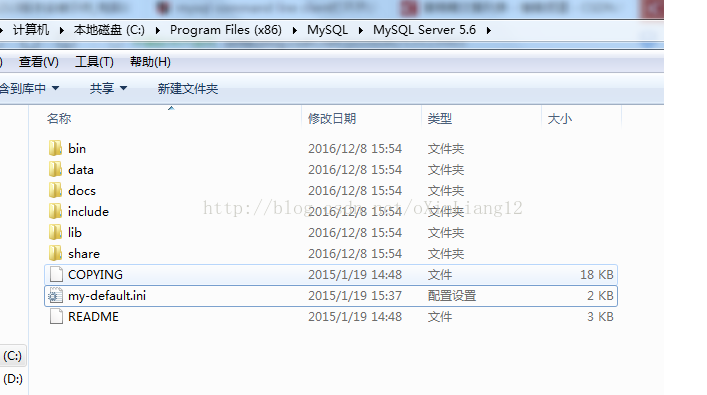 进入MySQL安装目录(如下图),并未看到有“my.ini”的配置文件,