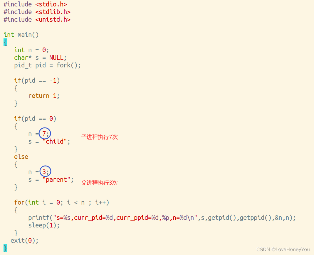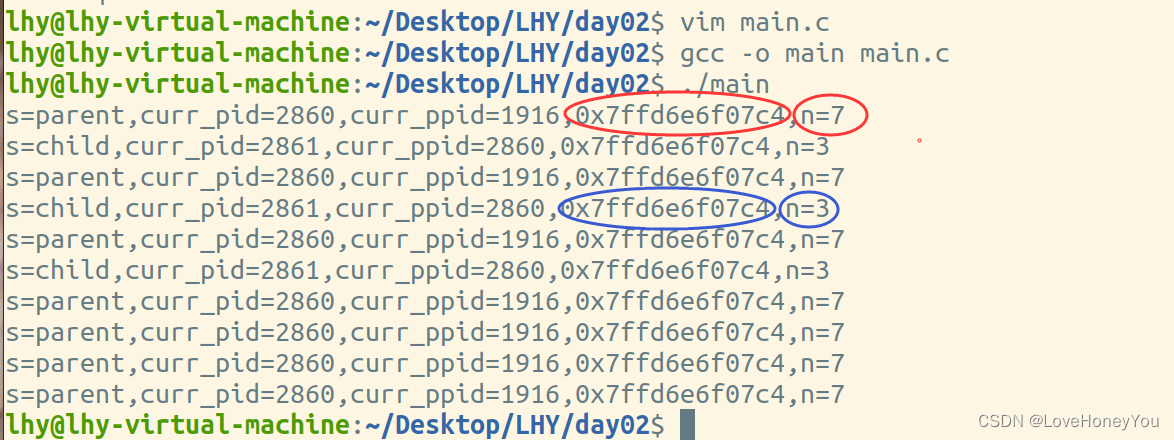 父进程和子进程有一个相同的变量n,他们的地址相同,但是值不同
