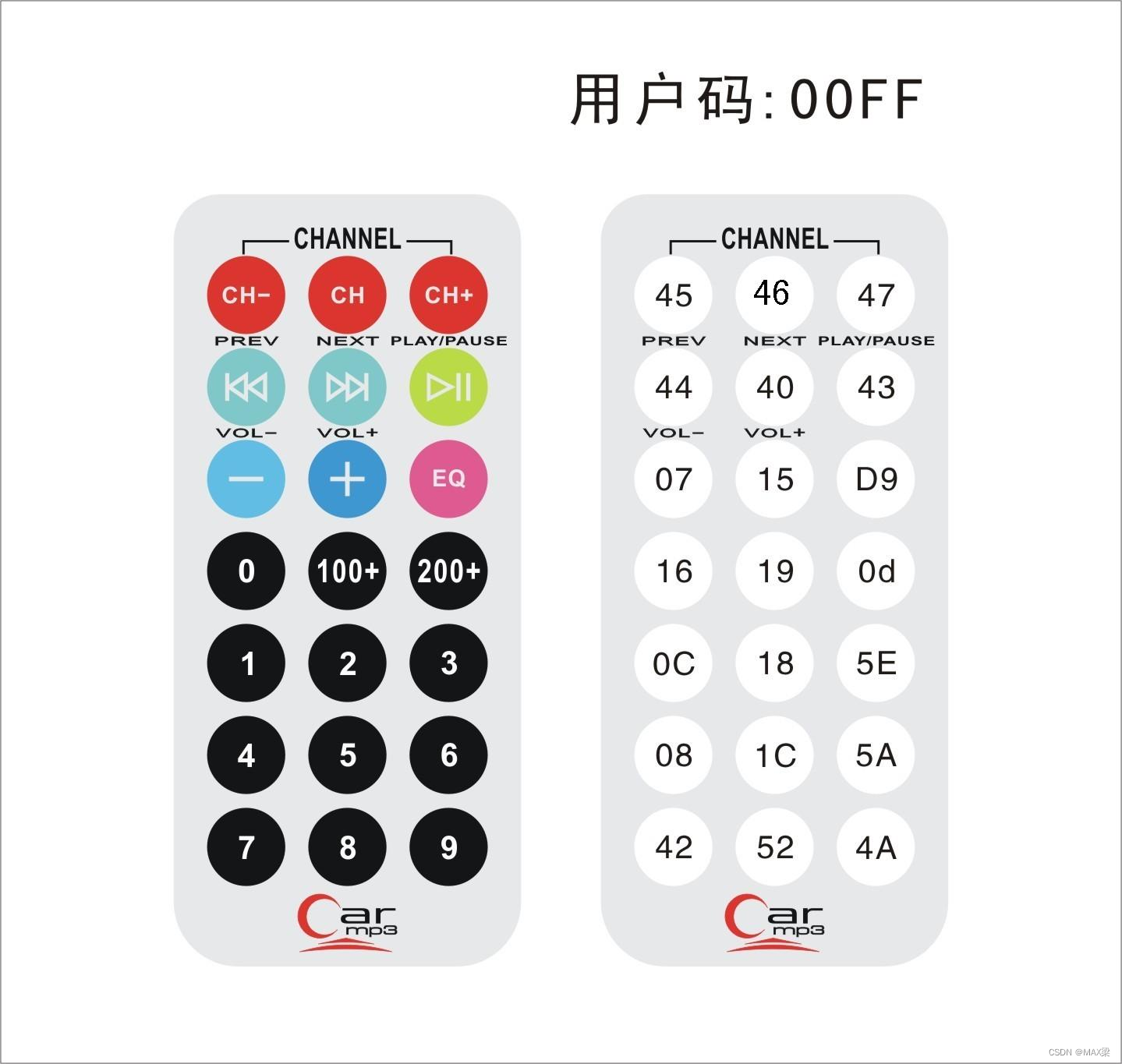 5、除此之外还自带红外接收模块以及红外遥控器进行遥控,我们需要理解红外遥控器上各个按键对应的码值进行转换到单片机上进行控制变换前进后退等等功能;同时官方配套的基础套件中还包括蓝牙模块的具体使用实例,(HC-06蓝牙模块,通过TX和RX进行串口通信,当你在手机端输入"ONF“时程序对应是小车前进函数,“ONE”则是使PWM输出终止,小车停止走到);