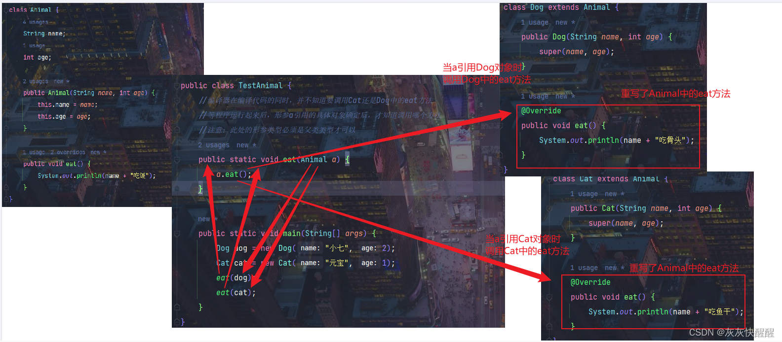 当类的调用者在编写eat这个方法时,参数类型为Animal(父类),此时在该方法内部不知道 ,也不关注当前的a引用指向的是哪个类型(哪个子类)的实例。此时a这个引用调用的eat方法可能会有多种不同的表现(和a引用的实例相关),这个行为就叫多态。