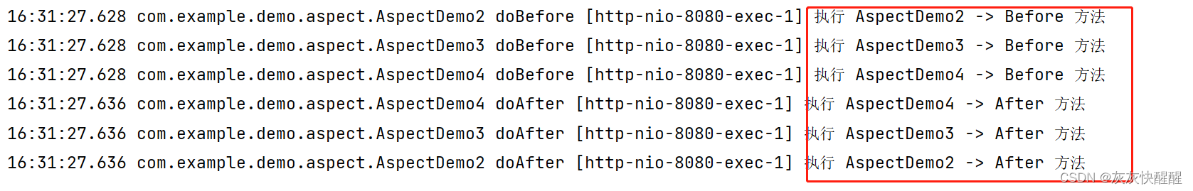 log.info("执⾏ AspectDemo3 -> Before ⽅法");