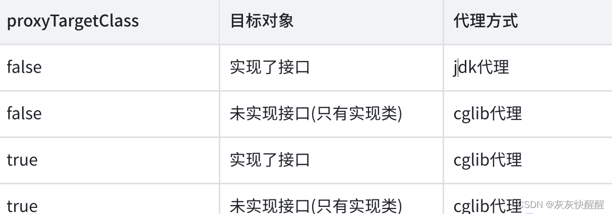 注意Spring和SpringBoot在这里AOP的实现也是有差异的, 代理工厂中有一个参数proxyTargetClass. 默认Spring是false, 默认接口使用jdk代理. SpringBoot从2.x之后设置为true, 默认全部使用CGLib实现代理.