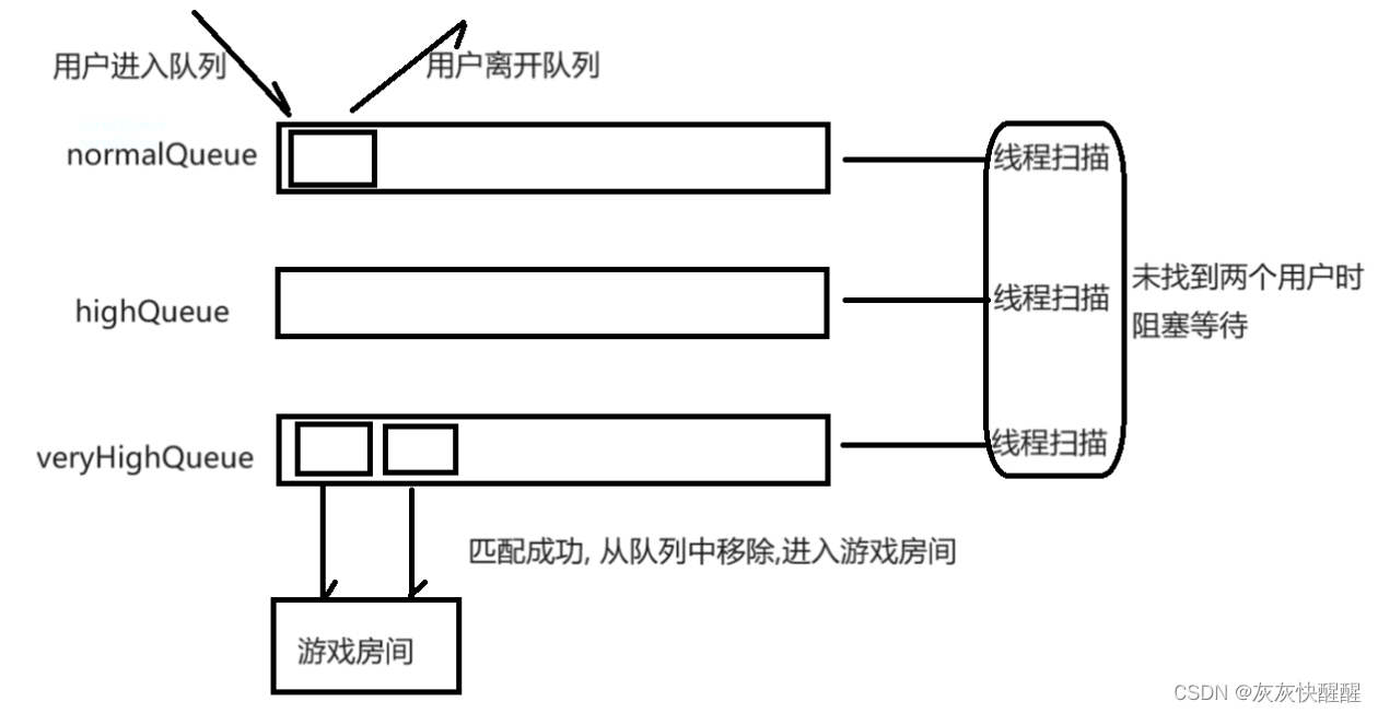 2.为了实现匹配功能的即时性, 我们也需要通过在不同段位的匹配队列中利用线程不断扫描,只要队列里的玩家凑成了一对, 就把它们放入房间里.