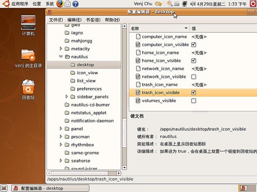 ,打开配置编辑器。这个配置编辑器外观有点像Windows的注册表编辑器。在左侧的树型结构中找到/apps/nautilus/desktop/