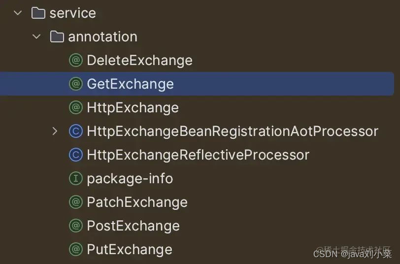 这些注解定义在spring-web模块的org.springframework.web.service.annotation包下,除了 HttpExchange 之外,其他的几个都是 HttpExchange 的特殊形式,这一点与 Spring MVC 中的 RequestMapping/GetMapping 等注解非常相似。