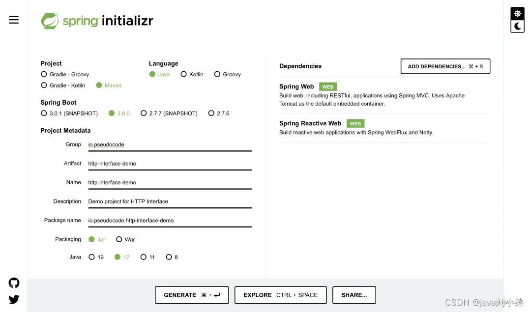 这里需要注意,Spring Boot 的版本至少需要是 3.0.0,这样它以来的 Spring Framework 版本才是 6.0 的版本,才能够包含 HTTP Interface 特性,另外,Spring Framework 6.0 和 Spring Boot 3.0 开始支持的 Java 版本最低是 17,因此,需要选择至少是 17 的 Java 版本。