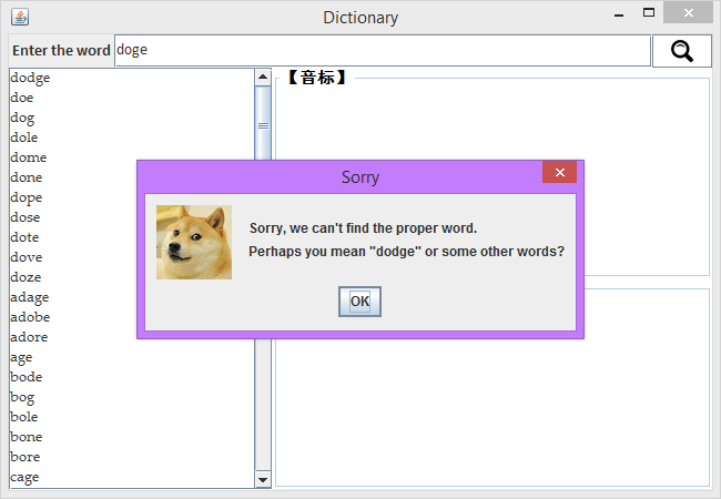 其实,我还有一个小彩蛋的啊,因为要实现如果用户输入一个错误的单词,要尽可能地根据字典内的单词进行纠错啊,这个时候我加了一个doge,不服来辩!!不知道会不会被杀掉...