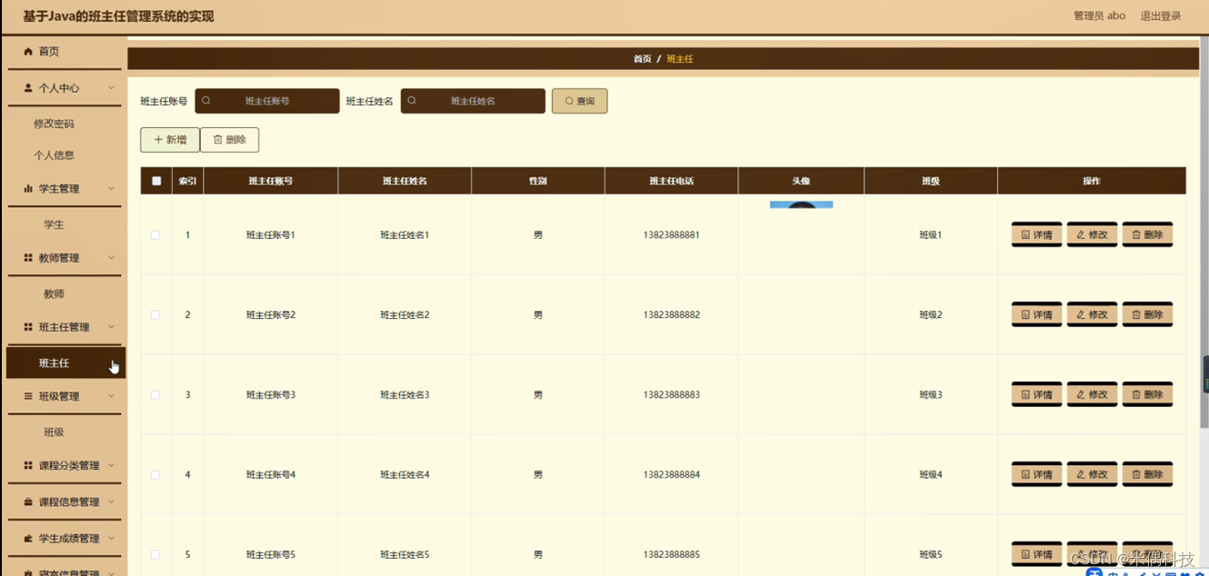班主任管理,在班主任管理页面可以对索引,班主任账号,班主任姓名,性别,班主任电话,头像,班级等内容进行详情,修改或删除等操作,如图5-5所示。