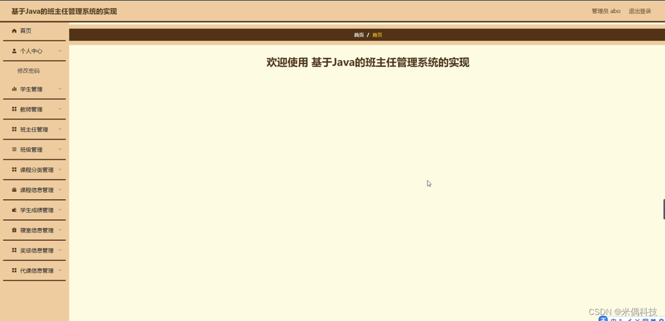 管理员登录系统后,可以对首页,个人中心,学生管理,教师管理,班主任管理,班级管理,课程分类管理,课程信息管理,学生成绩管理,寝室信息管理,奖惩信息管理,代课信息管理等功能进行相应的操作管理,如图5-2所示。