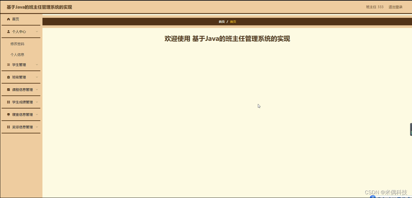 班主任登录系统后,可以对首页,个人中心,学生管理,班级管理,课程信息管理,学生成绩管理,寝室信息管理,奖惩信息管理等功能进行相应的操作管理,如图5-9所示。