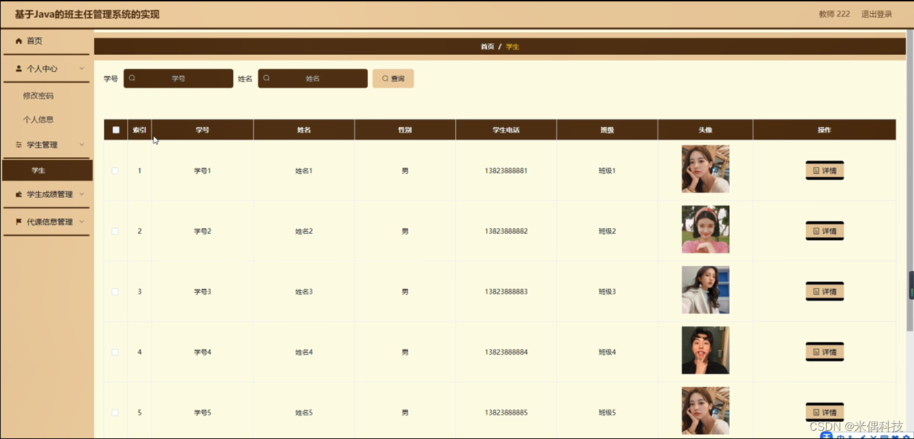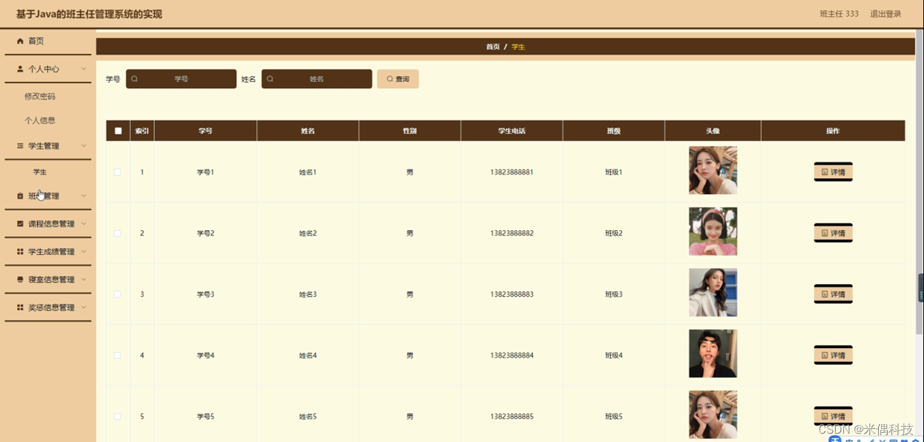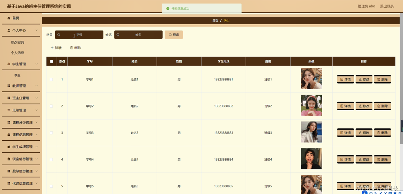 学生管理,在学生管理页面可以对索引,学号,姓名,性别,学生电话,班级,头像等内容进行详情,修改或删除等操作,如图5-3所示。