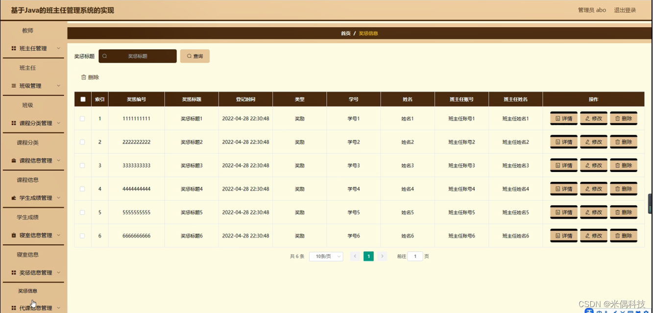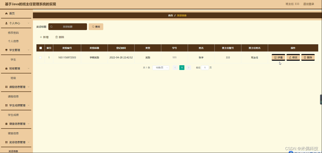 奖惩信息管理,在奖惩信息管理页面可以对索引,奖惩编号,奖惩标题,登记时间,类型,学号,姓名,班主任账号,班主任姓名等内容进行详情,修改或删除等操作,如图5-7所示。