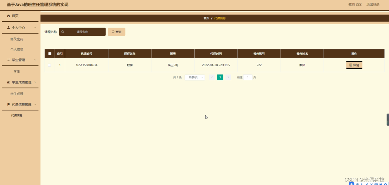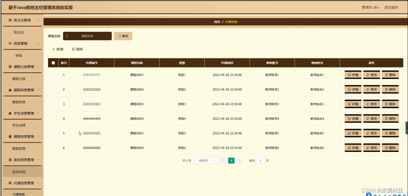 代课信息管理,在代课信息管理页面可以对索引,代课编号,课程名称,班级,代课时间,教师账号,教师姓名等内容进行详情,修改和删除等操作,如图5-8所示。