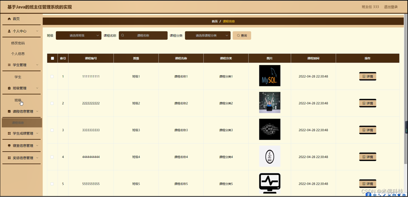 课程信息管理,在课程信息管理页面可以对索引,课程编号,班级,课程名称,课程分类,图片,课程时间等内容进行详情操作,如图5-11所示。