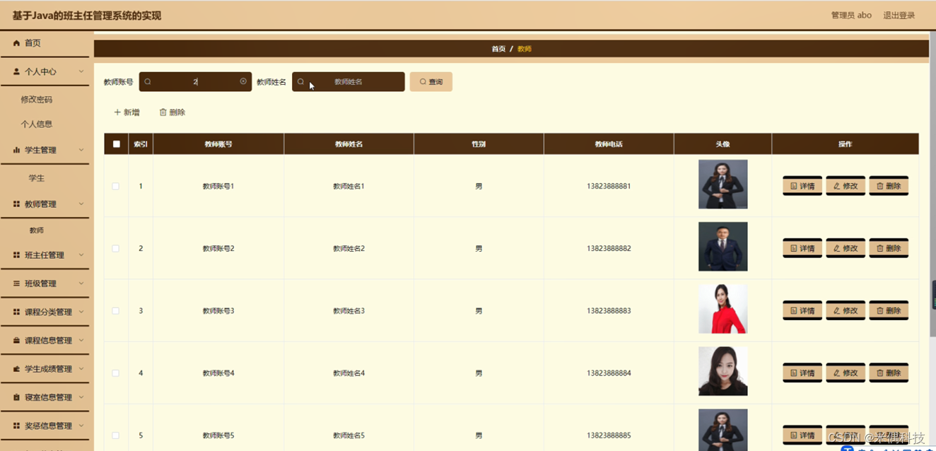 教师管理,在教师管理页面可以对索引,教师账号,教师姓名,性别,教师电话,头像等内容进行详情,修改或删除等操作,如图5-4所示。