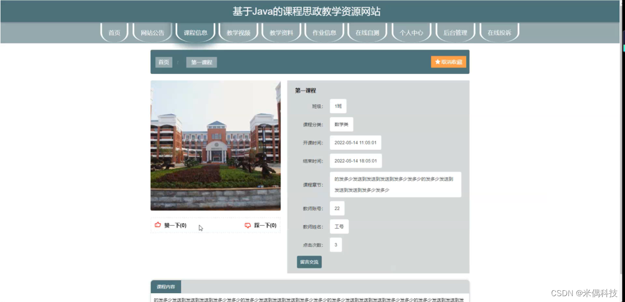 课程信息,在课程信息页面可以查看课程名称、班级、课程分类、开课时间、结束时间、课程章节、教师账号、教师姓名、点击次数、课程内容、图片等详细内容,并进行留言交流或收藏操作,如图5-2所示。