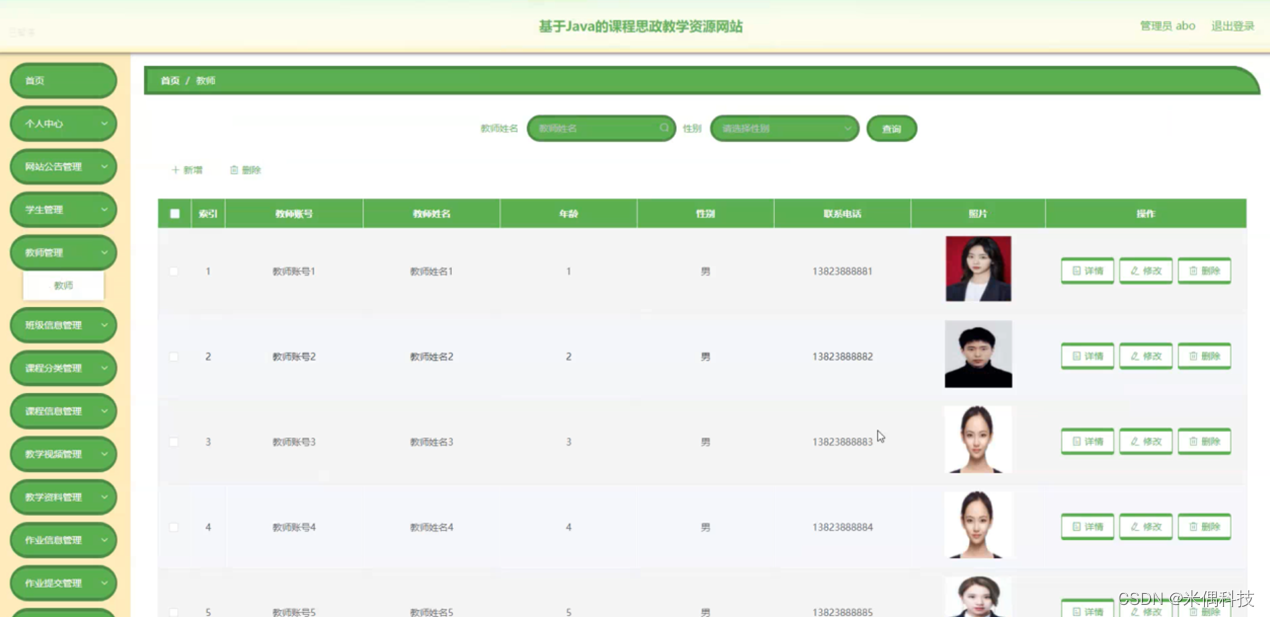 教师管理,在教师管理页面可以对美索引、教师账号、教师姓名、年龄、性别、联系电话、照片等内容进行详情、修改或删除等操作,如图5-10所示。