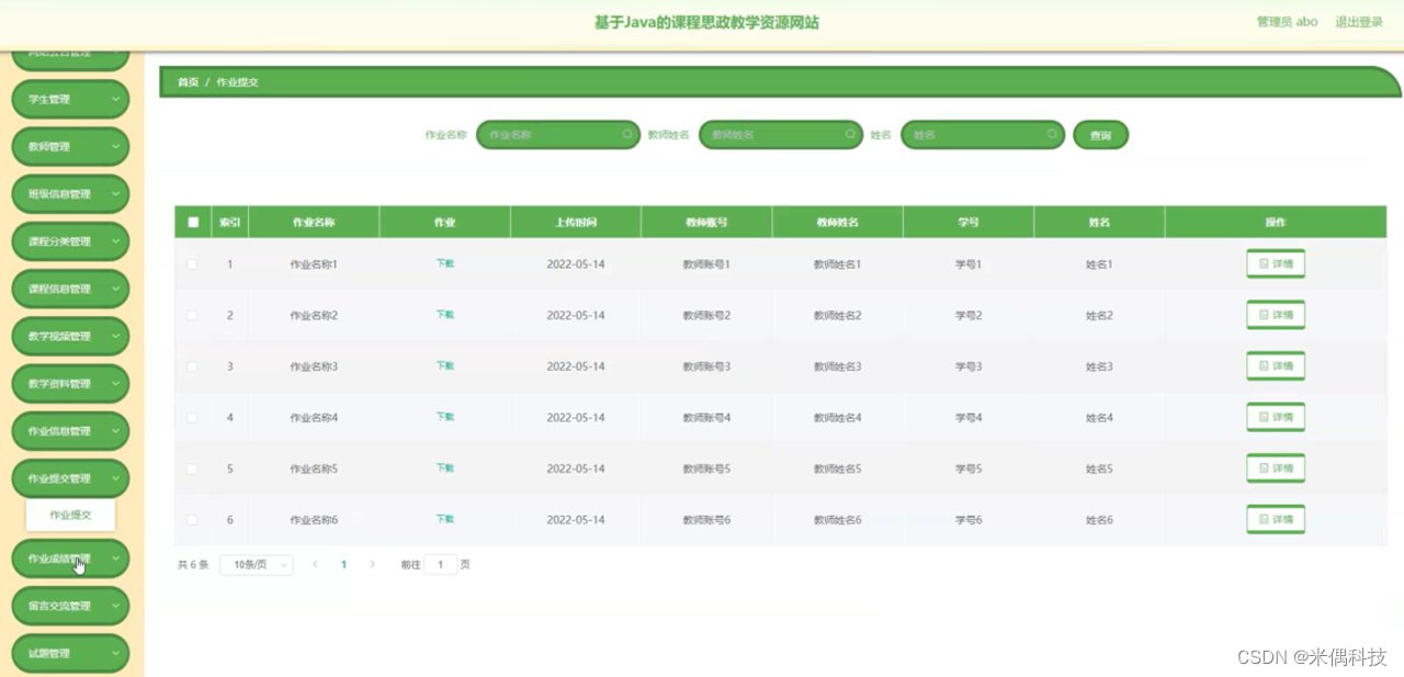 作业提交管理,在作业提交管理页面可以对索引、作业名称、作业、上传时间、教师账号、教师姓名、学号、姓名等内容进行详情等操作,如图5-14所示。