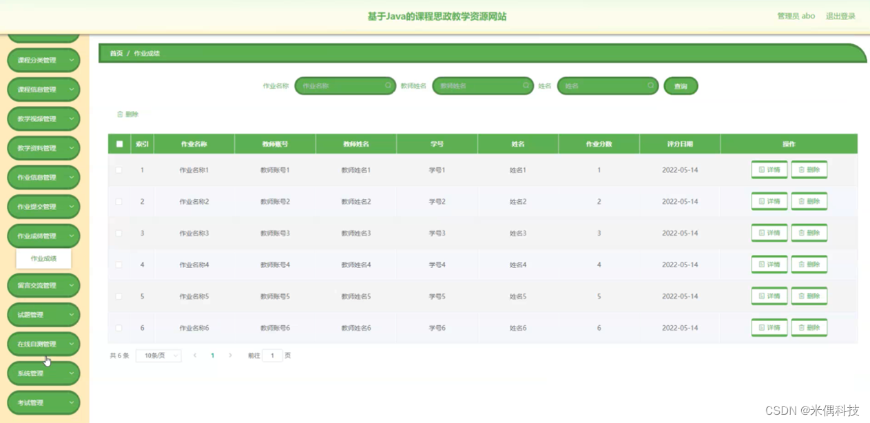 作业成绩管理,在作业成绩管理页面可以对索引、作业名称、教师账号、教师姓名、学号、姓名、作业分数、评分日期等内容进行详情、删除等操作,如图5-15所示。