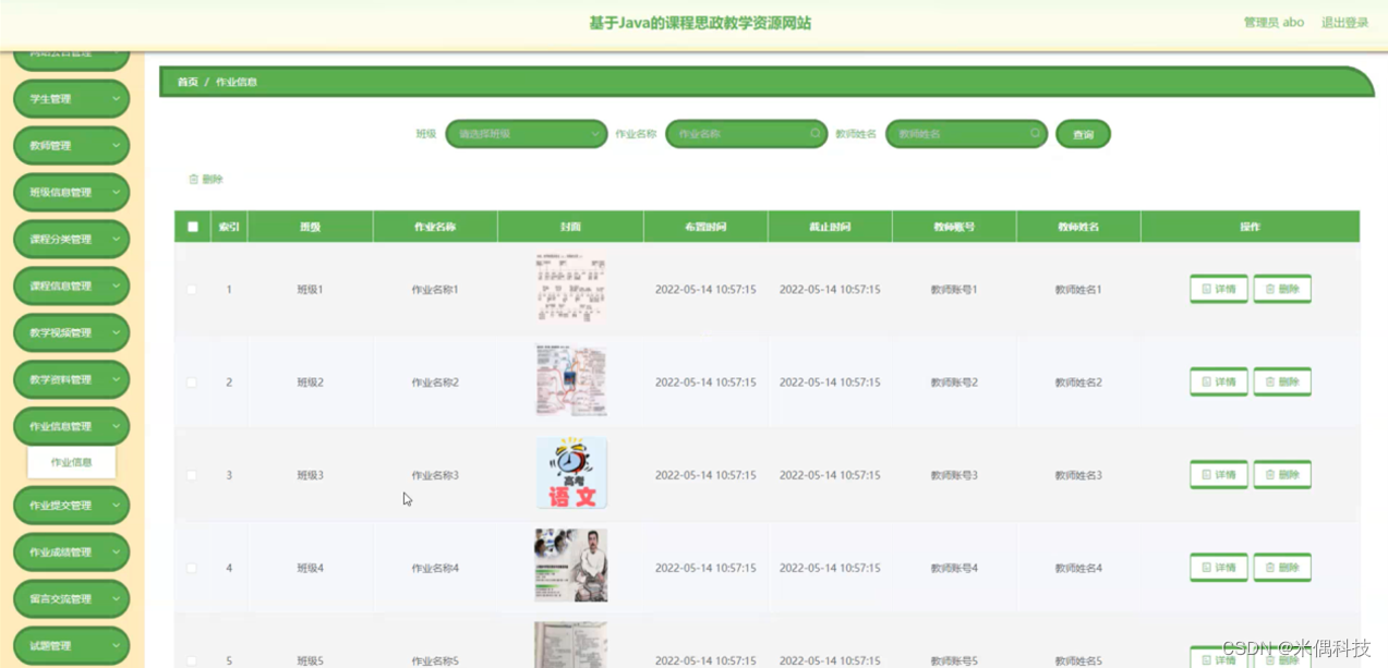 作业信息管理,在作业信息管理页面可以对索引、班级、作业名称、封面、布置时间、截住时间、教师账号、教师姓名等内容进行详情、修改等操作,如图5-13所示。