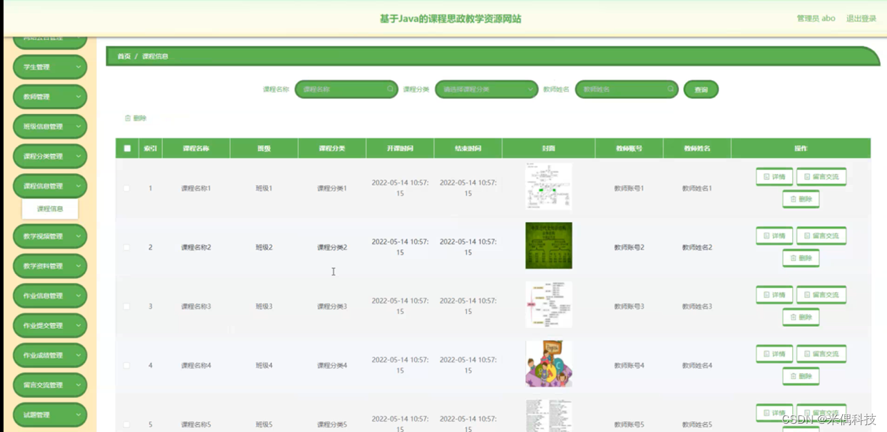 课程信息管理,在课程信息管理页面可以对索引、课程名称、班级、课程分类、开课时间、结束时间、封面、教师账号、教师姓名等内容进行详情、留言交流、删除等操作,如图5-11所示。