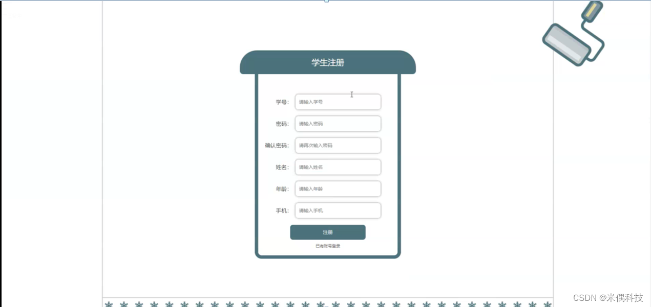 学生注册,在学生注册页面通过填写学号、密码、确认密码、姓名、年龄、手机等信息完成注册操作,如图5-5所示。