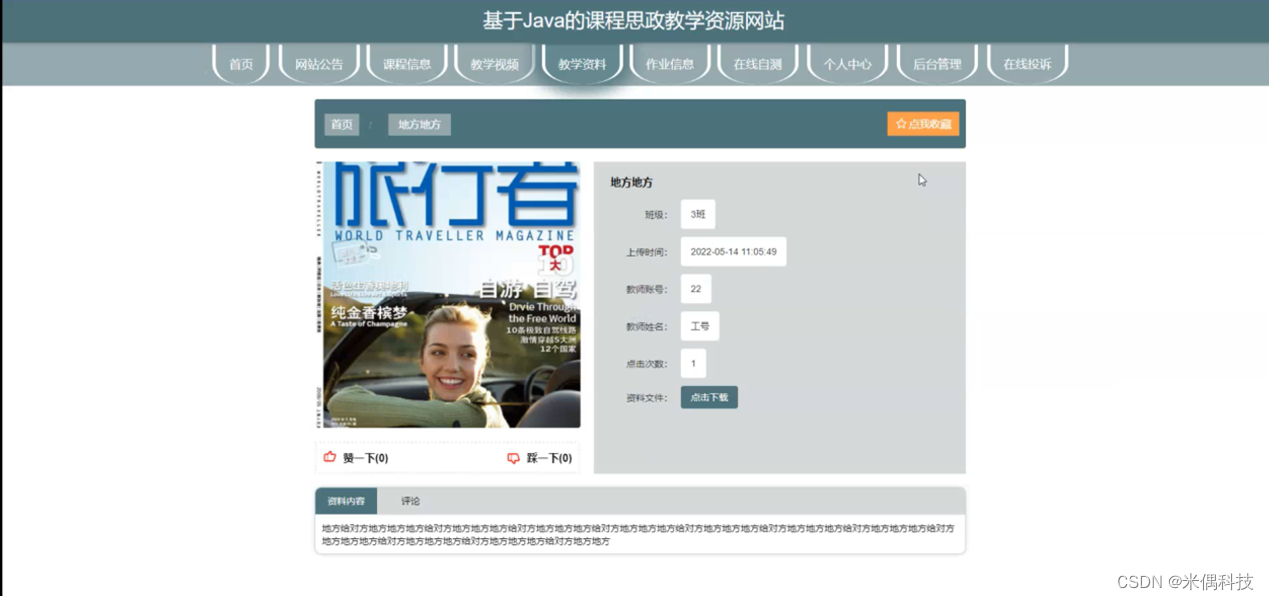 教学资料,在教学资料页面可以查看资料名称、班级、上传时间、教师账号、教师姓名、点击次数、资料文件、资料内容、封面等详细内容,并进行评论、点赞、收藏操作,如图5-4所示。