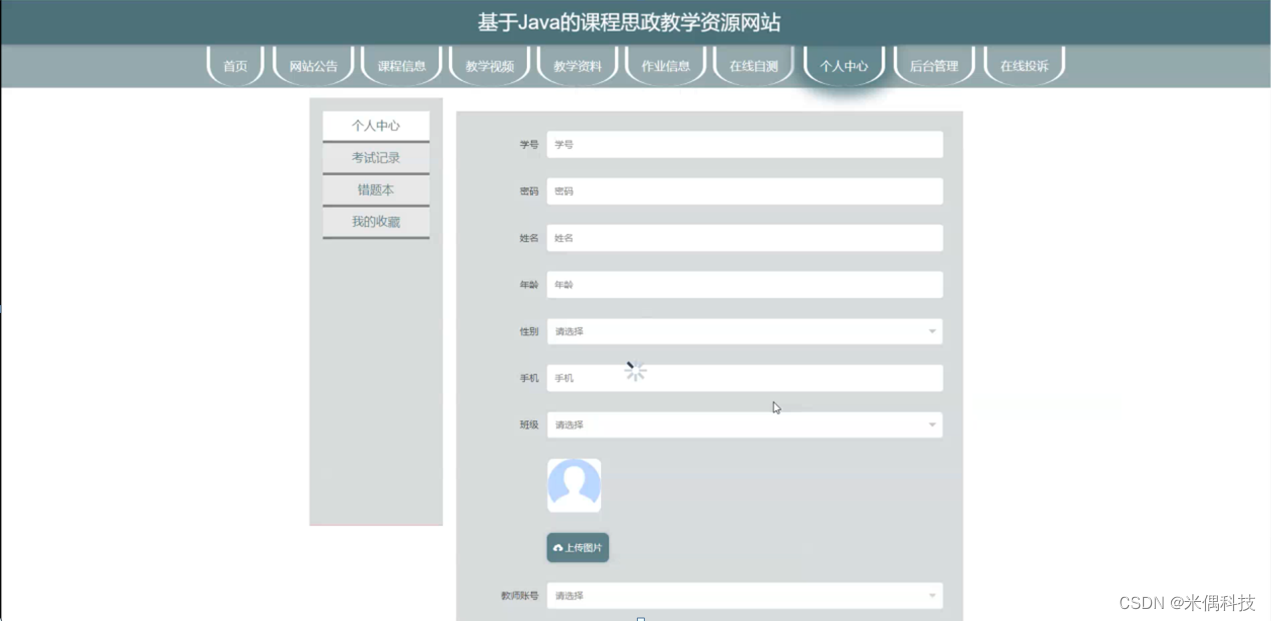 个人中心,在个人中心页面通过填写学号、密码、姓名、年龄、性别、手机、班级、上传图片、教师账号等内容进行更新信息,根据需要对考试记录、错题本、我的收藏进行相对应操作,如图5-6所示。