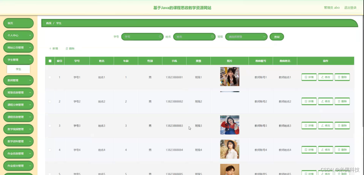 学生管理,在学生管理页面可以对索引、学号、姓名、年龄、性别、手机、班级、照片、教师账号、教师姓名等内容进行详情,修改和删除等操作,如图5-9所示。