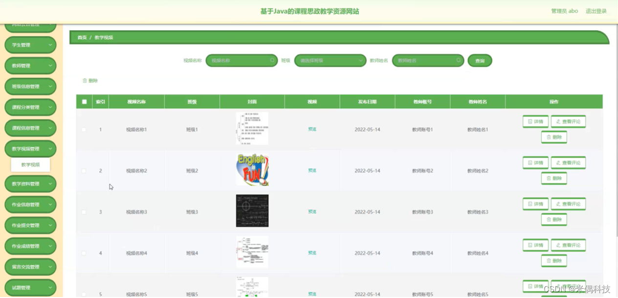教学视频管理,在教学视频管理页面可以对索引、视频名称、班级、封面、视频、发布日期、教师账号、教师姓名等内容进行详情、查看评论和删除等操作,如图5-12所示。