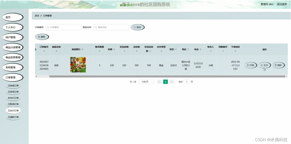 订单管理;在已支付订单页面中可以查看索引,订单编号,商品名称,商品图片,购买数量,价格,折扣价格,总价格,折扣总价格,支付类型,状态,地址,电话,收货人,团购编号,下单时间等内容,并进行详情,发货和删除等操作;还可以对已取消订单,已退款订单,已完成订单,已发货订单,未支付订单进行详细操作;如图4-11所示。