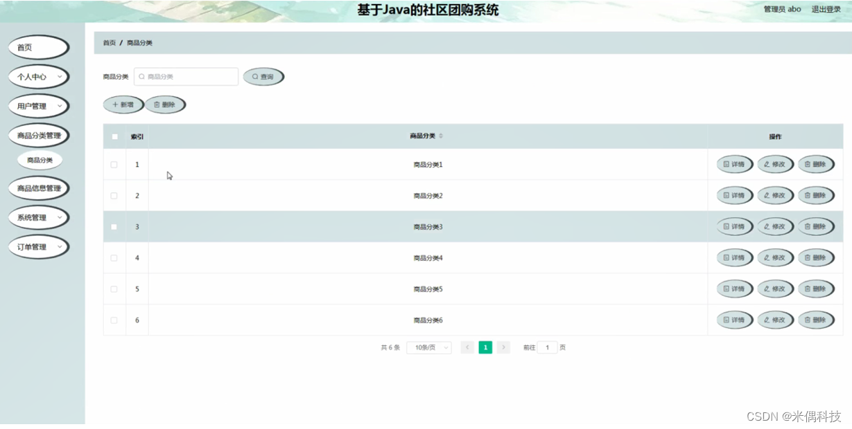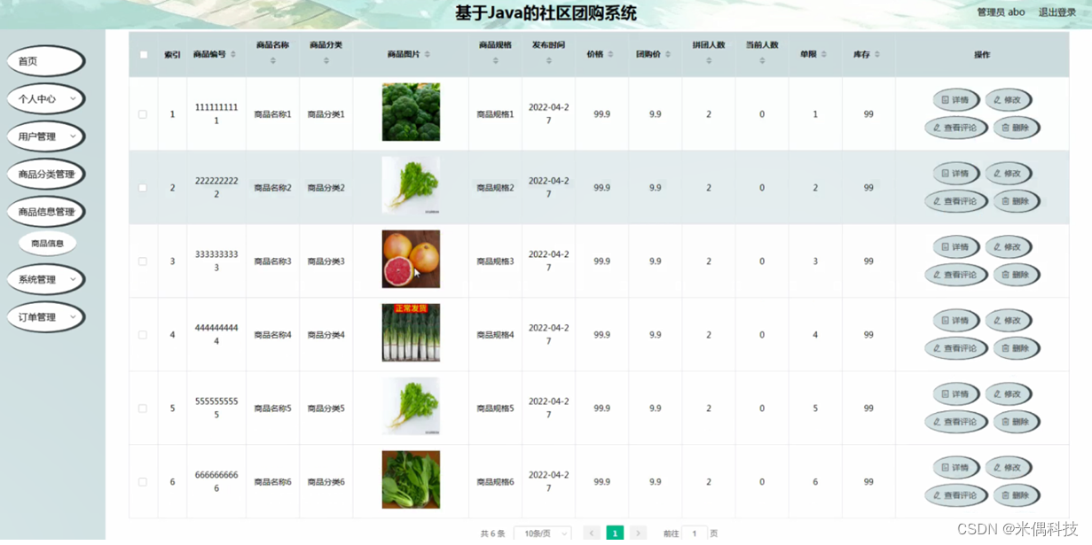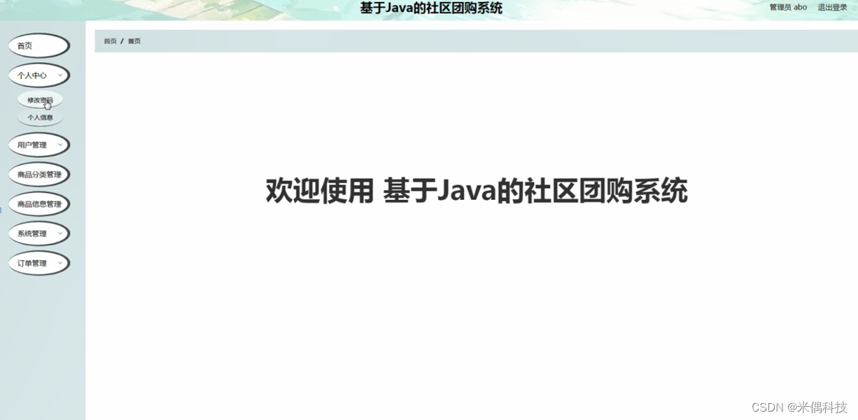 管理员登录进入基于Java的社区团购系统可以查看首页,个人中心,用户管理,商品分类管理,商品信息管理,系统管理,订单管理等信息进行详细操作,如图4-6所示。