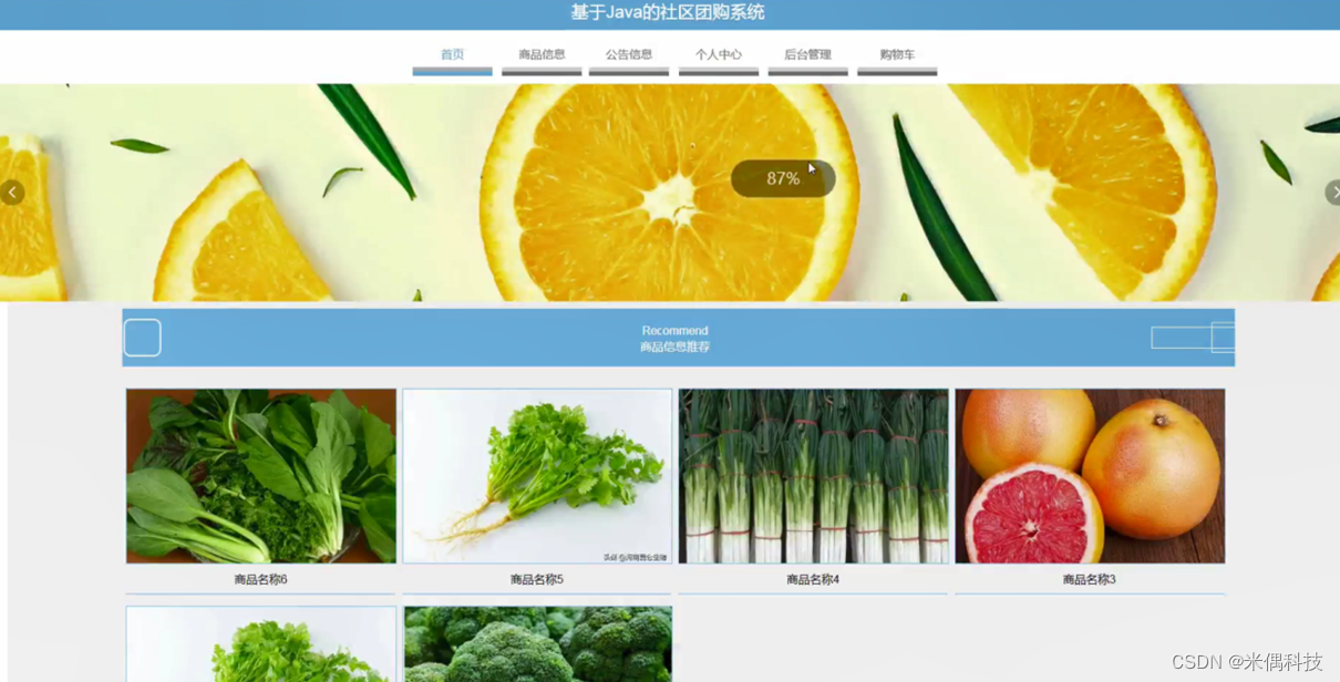 基于Java的社区团购系统,用户进入到系统首页,可以查看首页,商品信息,公告信息,个人中心,后台管理,购物车等内容进行操作,如图4-1所示。
