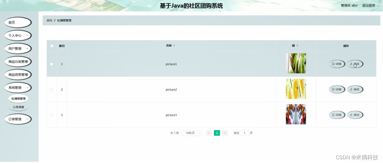 系统管理;在轮播图管理页面中可以查看索引,名称,值等内容,并进行详情,修改等操作;还可以对公告信息进行详细操作;如图4-10所示。