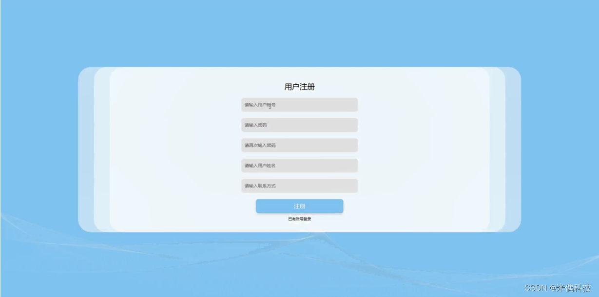 用户注册;在用户注册页面中输入用户账号,密码,确认密码,用户姓名,联系方式等内容进行用户注册操作;如图4-3所示。