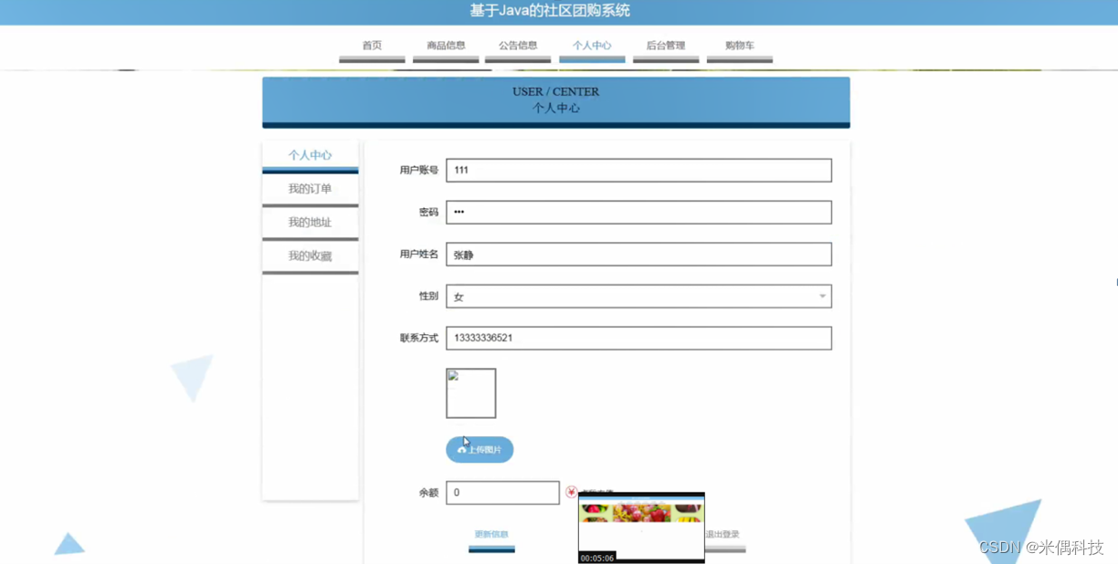在个人中心页面中输入用户账号,密码,确认密码,用户姓名,性别,联系方式,头像,余额等内容进行更新信息,并可以根据需要对我的订单,我的地址,我的收藏进行相应的操作,如图4-4所示。