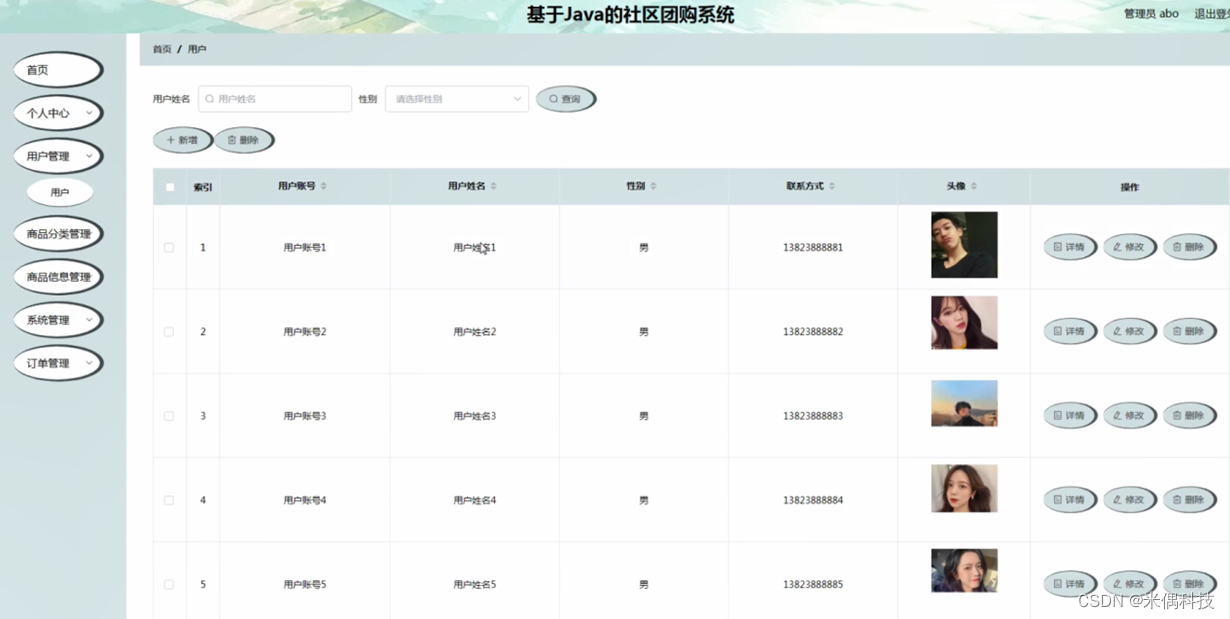 用户管理;在用户管理页面中可以查看索引,用户账号,用户姓名,性别,联系方式,头像等内容,并进行详情,修改和删除等操作;如图4-7所示。
