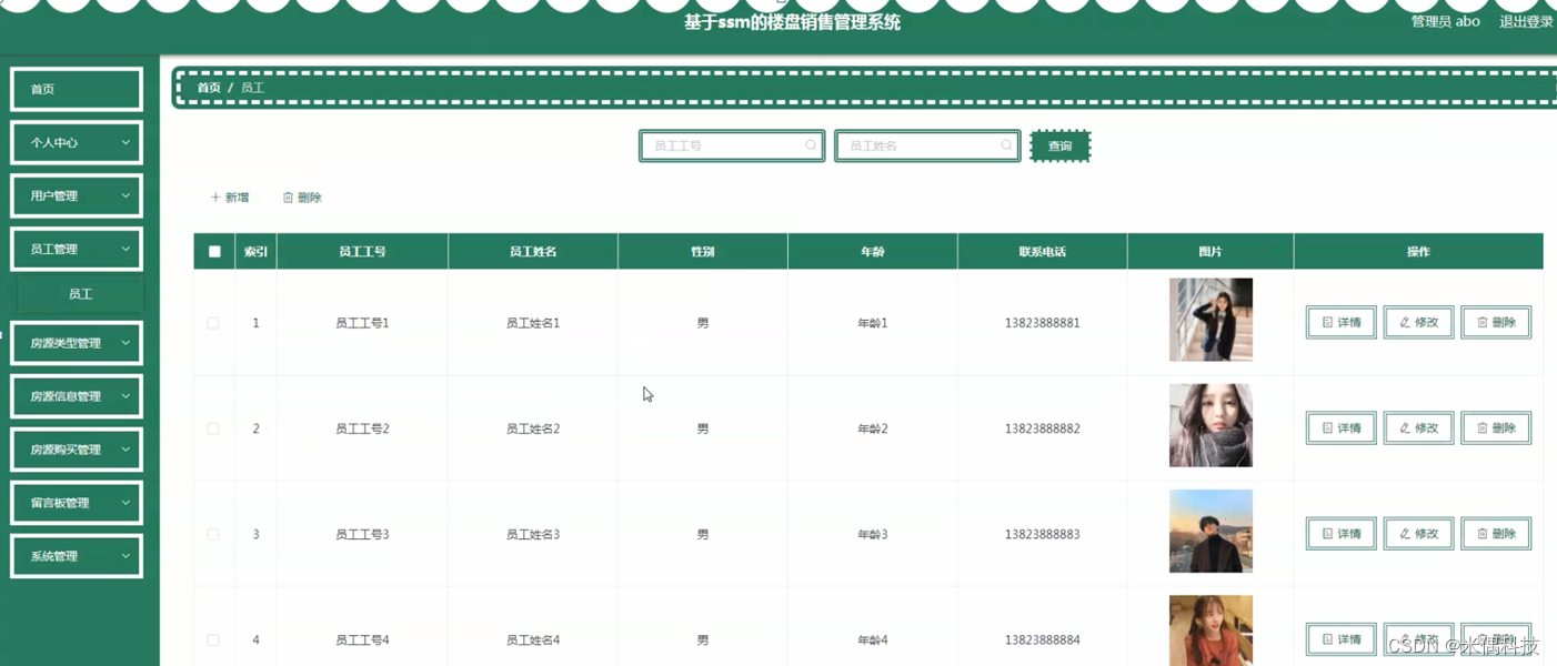 在员工管理页面,管理员可以对员工工号、员工姓名、性别、年龄、联系电话、图片等进行查看详情、修改、删除或新增等操作,如图5-10所示。